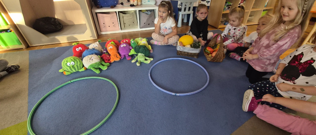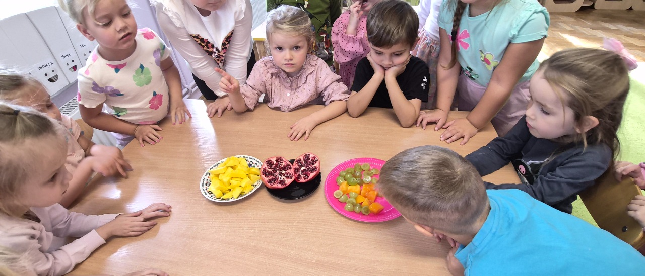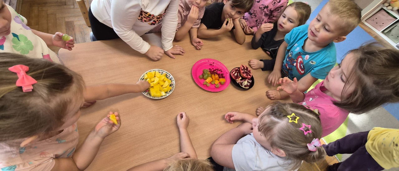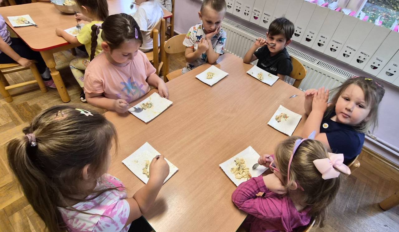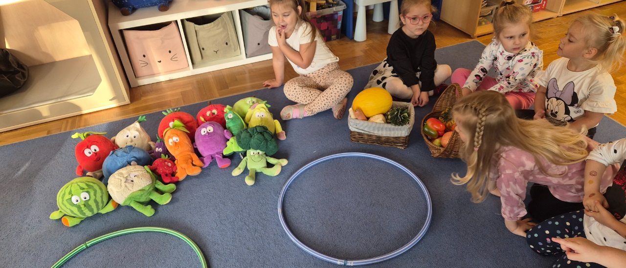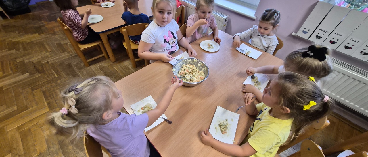 Żuczki miały okazję poznać wybrane owoce i warzywa. Dzieci mogły sprawdzić ich zapach, kolor i kształt. Zwieńczeniem zajęć była degustacja owoców oraz przyrządzenie sałatki warzywnej.