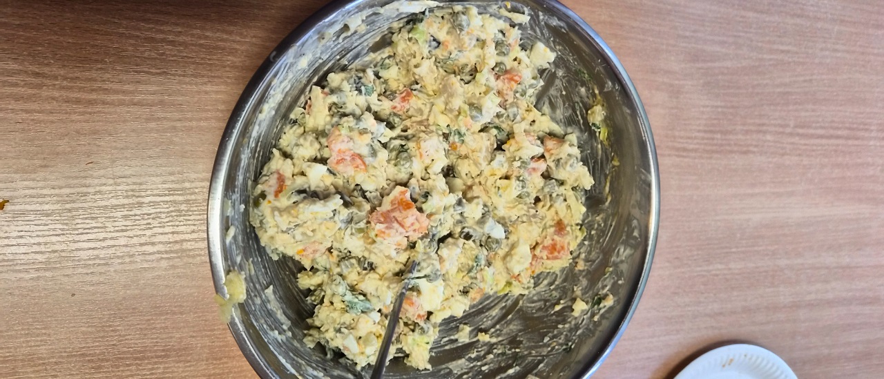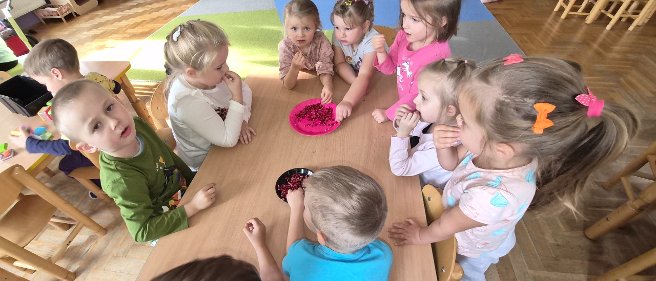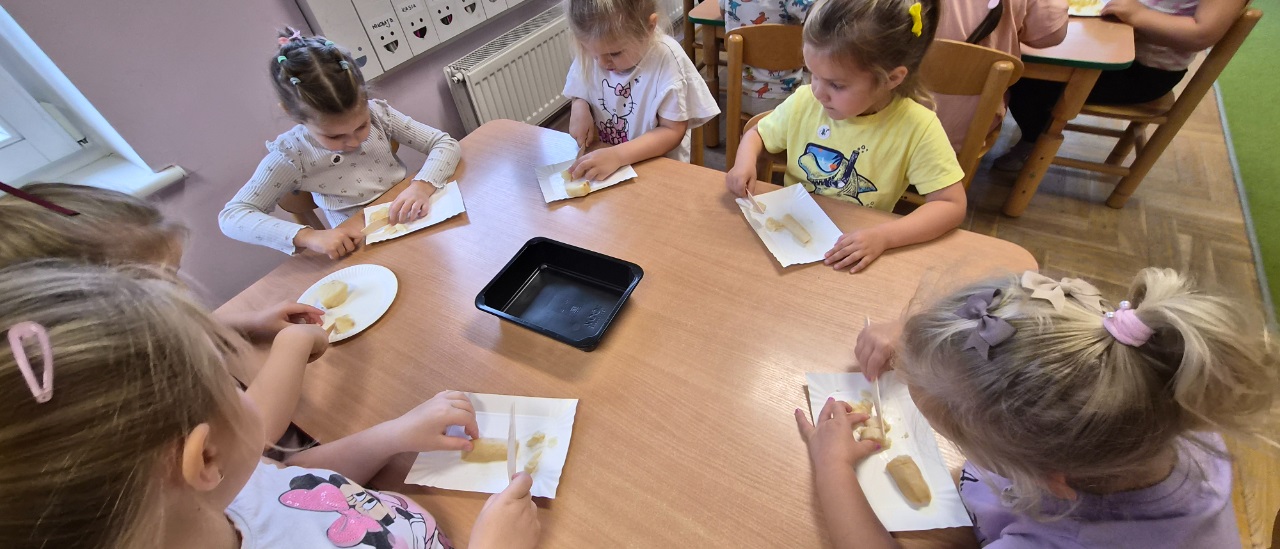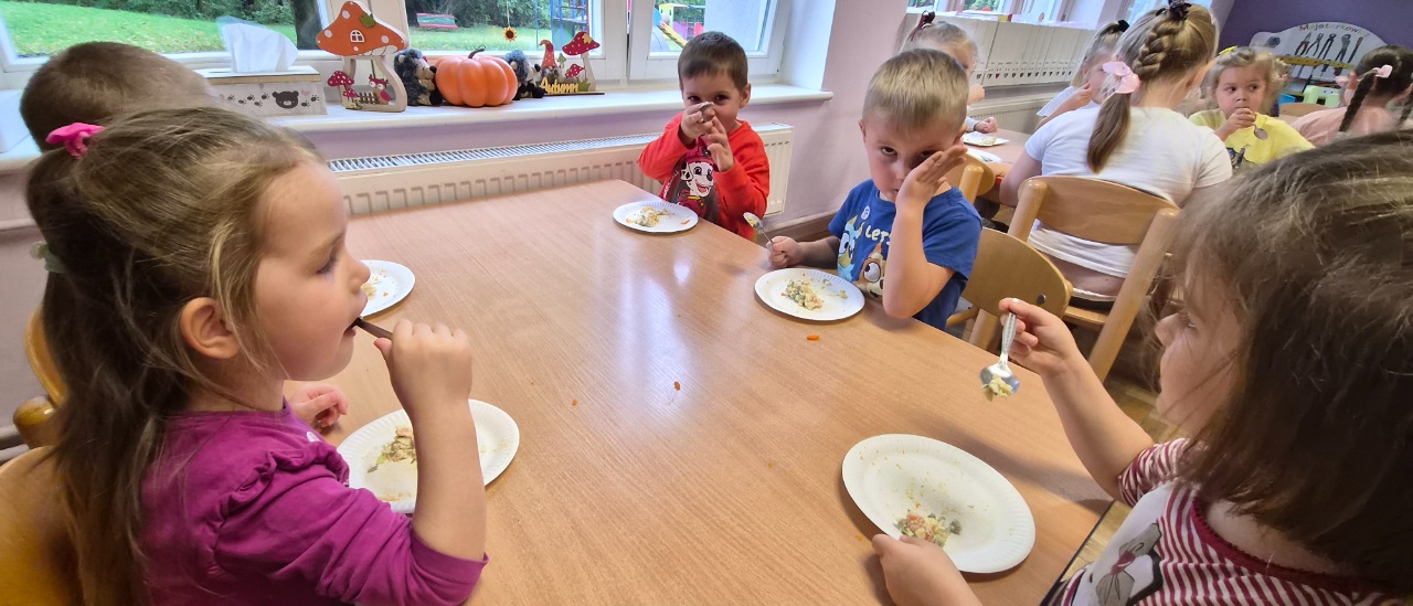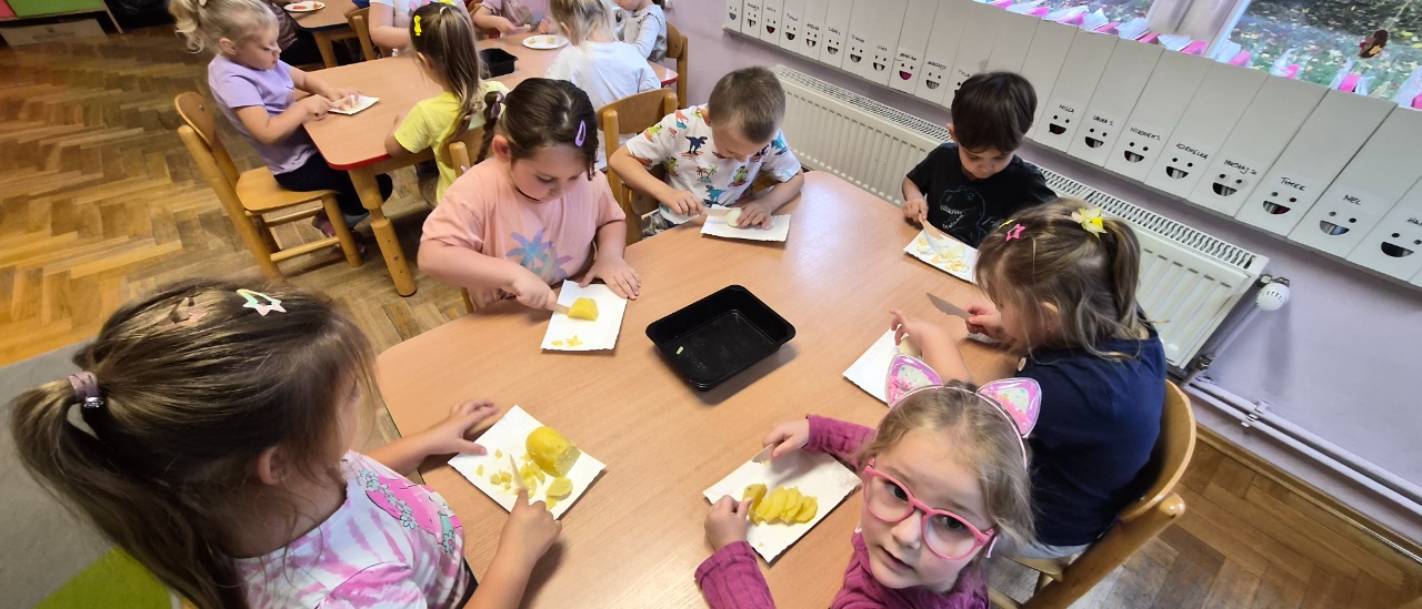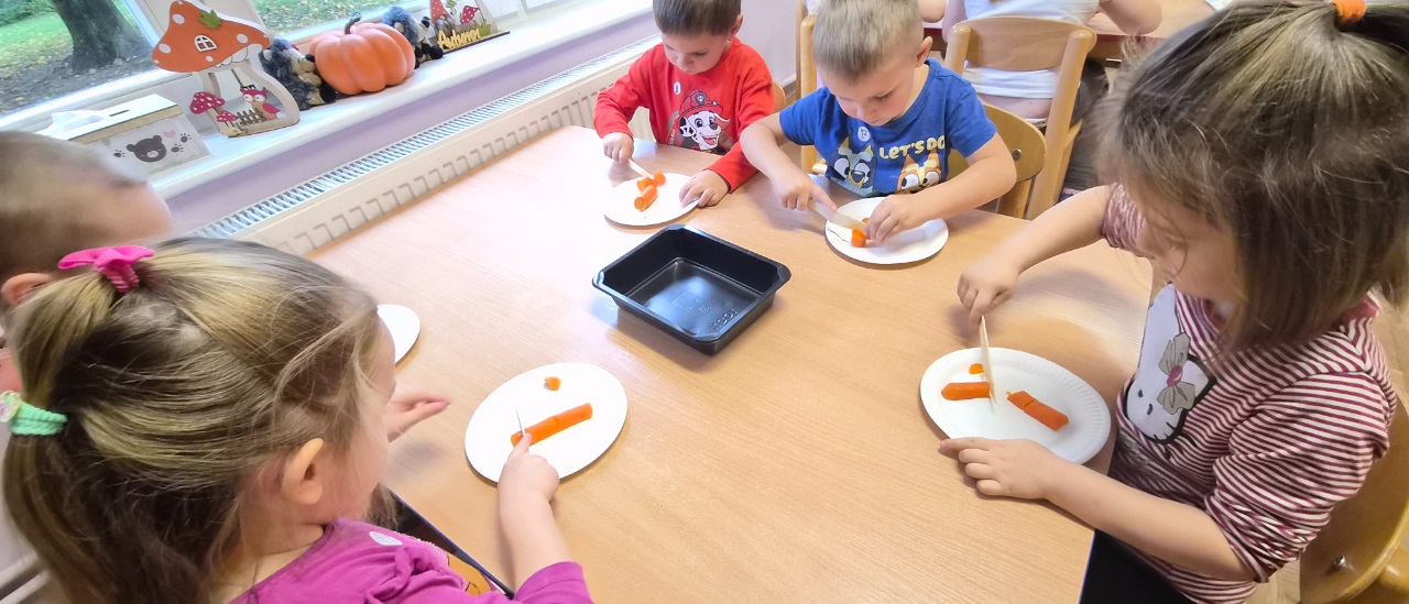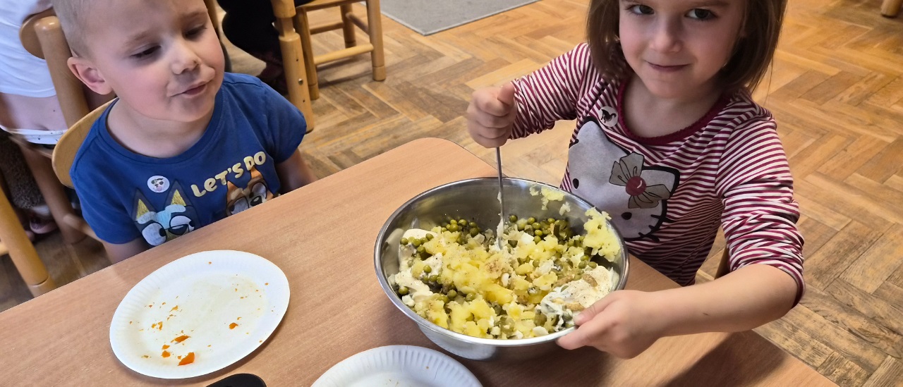 Żuczki miały okazję poznać wybrane owoce i warzywa. Dzieci mogły sprawdzić ich zapach, kolor i kształt. Zwieńczeniem zajęć była degustacja owoców oraz przyrządzenie sałatki warzywnej.